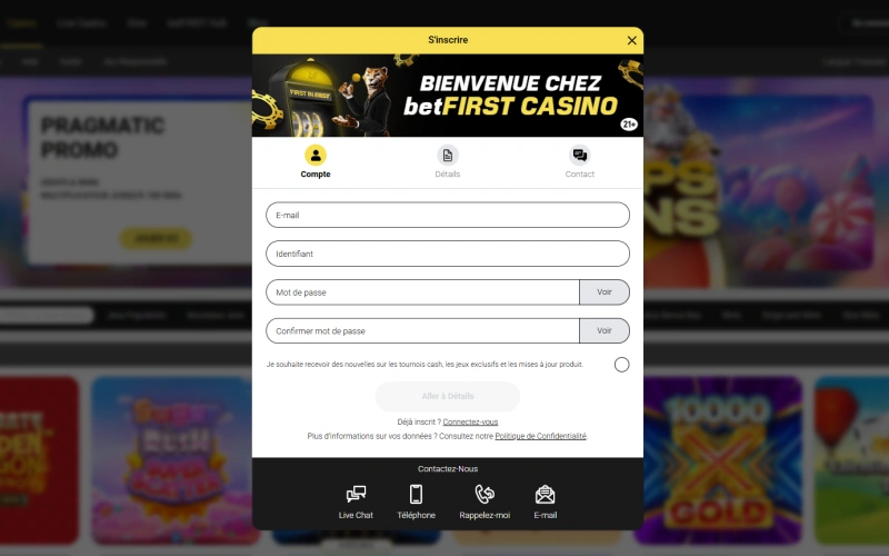 - Rendez-vous sur le site officiel de BetFIRST casino inscription et cliquez sur le bouton d’inscription